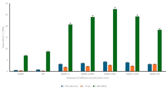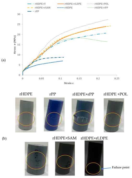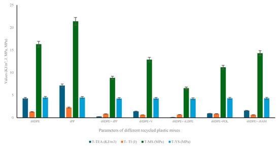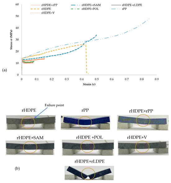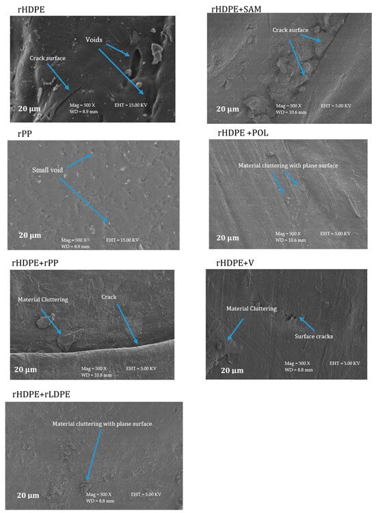 Recycled high-density polyethylene (rHDPE) and polypropylene (rPP) blends have been extensively studied to assess their mechanical properties and their potential applications in various industries. The mechanical properties of rHDPE and rPP are influenced by processing conditions, blending ratios, and contamination from prior use. Table 3 is a depiction of different ratios of rHDPE with blends. Studies indicate that as the percentage of recycled polymer increases, the mechanical properties, such as tensile strength and Young’s modulus, tend to degrade due to molecular chain scission and lower crystallinity [93]. Research [96] on PP:HDPE blends has shown that tensile properties degrade after multiple recycling cycles. The Young’s modulus and yield strength of rPP:rHDPE blends were found to be lower than those of virgin polymer blends due to structural degradation during the recycling process. However, at rPP contents exceeding 75%, the yield strength of the recycled blends approached that of virgin materials. This decline in mechanical properties is primarily attributed to a reduction in crystallinity, molecular weight degradation, and the formation of imperfect crystalline structures [96].
