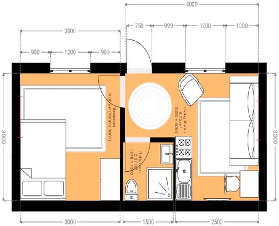 The architectural drawings of the containers were taken from the container manufacturers, who sent these containers to the relief camp. Then, a replica of the architectural drawings was drawn in an architectural drawing tool to integrate it into the Dynamic Building Energy Simulation Tool, as shown in Figure 4. A traditional container has dimensions of 7 m × 3 m with a height of 2.5 m. There are no green areas around the containers. The energy model of the camp was developed in DesignBuilder, as shown in Figure 5 [30]. DesignBuilder is a comprehensive software tool used for building performance simulation and energy analysis; therefore, the authors selected to use this tool. First, a traditional container was designed in the tool, and then 30 traditional houses with the same architectural configuration were simulated. The traditional container, which has a bathroom, bedroom, and living room, is called the “baseline model” in this study.