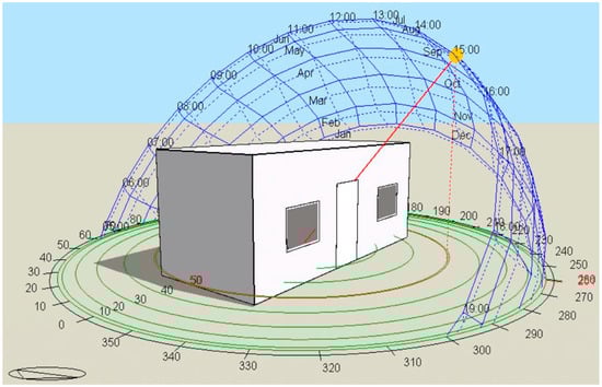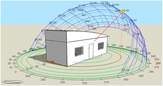 Material properties are important for calculating heat transfer between the two different zones. The U values of the components of the case house are shown in Table 1. The container houses are constructed from custom-shaped sandwich panels with EPS filling, and the exterior surface coatings are RAL 9002 electrostatically painted sheet metal. The same configuration is used for the roof and ground; however, the insulation thicknesses are different. For the walls, 50 mm thick, 12 kg/m3 polystyrene foam (EPS) is used, while 125 mm thick, 16 kg/m3 EPS was selected for the roof. The windows and doors of the traditional container house are made from PVC material. A PVC window with dimensions of 890 × 1135 mm was installed in the simulation tool for this study. The windows are a single sash that opens 90 degrees. The door frame is made of 1.2 mm thick painted sheet metal, and the door body is made of 0.5 mm thick painted sheet metal. It is a metal door with a sealing gasket.