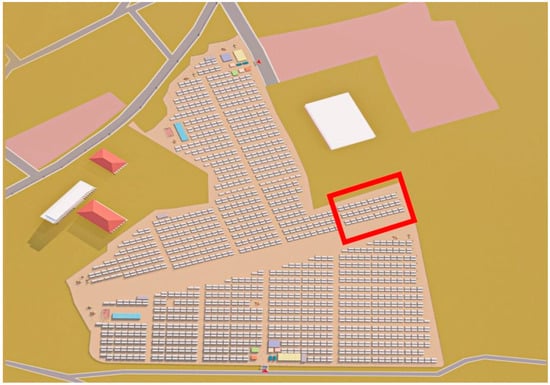 The population of Hatay reflects a diverse ethnic and cultural makeup, including a majority of Turks, as well as a significant Arab community. Additionally, there are various Christian and other religious groups present in the region. On the other hand, Hatay has a Mediterranean climate, with hot, dry summers and mild, wet winters, which contributes to its rich agriculture. However, the province was highly affected by two big earthquakes with a magnitude of 7.1 and 7.2 in 2023. As of 2024, there are 17 container cities in Hatay. Approximately 100,000 people live in these container cities. To this aim, a relief camp with 100 housing containers in Hatay was selected as a case study in this study. However, due to the long duration of the simulations, only 30 containers were selected as a case zone in this study. The selected relief camp was constructed in 2023 after the big earthquakes, as shown in Figure 3. According to the author’s knowledge, approximately 400 earthquake victims are staying in this relief camp.