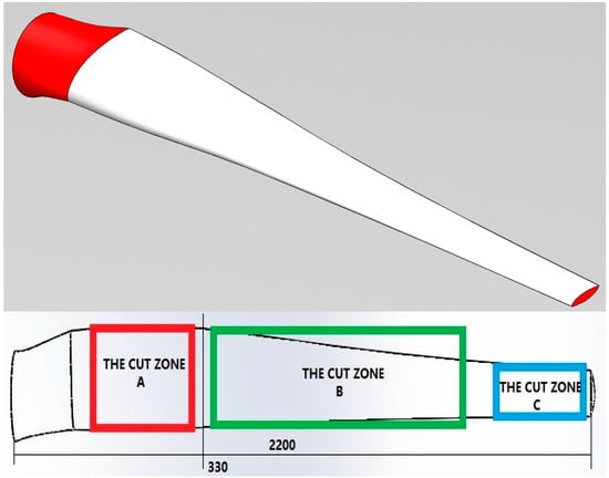 Figure 8 depicts the CAD modeling and used zones of the E44-900 blade. The length of the blade was 22 m, and the largest distance of the width was 3.3 m long. Therefore, cut zone A was used for the walls of the WTB-bH, while zone B was for the roof and ground constructions. The edge of the blade was used for window frames and the door. One can note that wind turbine blades are typically large and complex structures, therefore making it challenging and generally inadvisable to cut and reattach the blade sections. However, in specific situations such as in this study or for particular applications, cutting procedures are considered. For cutting and bonding, the following procedures were applied for this study: