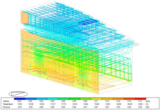 The Computational Fluid Dynamics (CFD) analysis conducted on the wind turbine blade-based housing (WTB-bH) design provides a detailed examination of the distribution of dynamic pressure, temperature, and velocity magnitude, along with the flow streamlines surrounding the structure. As shown in Figure 11, airflow velocities range from 0 to 0.17 m/s, with a temperature distribution between 15.91 °C and 20.91 °C, and a pressure gradient varying between −0.01 and 0.02 Pa. These parameters were modeled to reflect the environmental conditions typically observed in regions like Hatay, Türkiye. The simulation results demonstrate distinct airflow patterns, with higher velocities indicating areas of increased ventilation and significant heat exchange, while zones with lower velocities experience restricted air movement, which contributes to thermal inefficiencies.