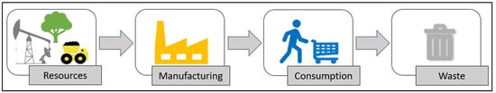 Since the Industrial Revolution, the dominant economic model has been the Linear Economy (LE), characterized by a “take–make–use–dispose” approach [27,28,29,30], as illustrated in Figure 1.