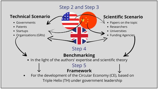 In this step, we defined the search parameters for data collection in scientific and technical databases (e.g., Scopus and Lens), focusing on relevant articles and patents related to the CE. Country classification criteria were also determined, considering both the H-Index (which assesses productivity and academic impact) and the number of patents registered in the CE [20,84,85]. Based on this combination, we identified the final ranking of countries. The United Kingdom, China, and the United States were selected due to their significant contributions and initiatives in the field of the CE, making them the most representative of the scope of the study [86]. Figure A1 illustrates the method used to select these three countries.