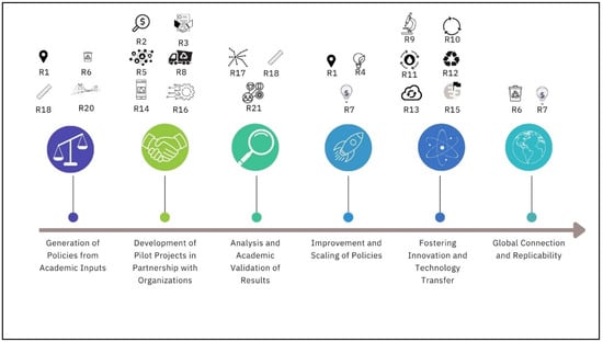 To accelerate the transition toward the CE, the strategy “Establishment of public–private partnerships” (R3) highlights the importance of alliances among the public, private, and academic sectors, ranging from the efficient use of resources to encouraging the implementation of advanced technologies in environmental management. These cross-sector collaborations are essential for integrating knowledge, resources, and strategies to drive innovation in products, services, and processes that meet the environmental demands of the 21st century. For example, governments can leverage these partnerships to promote urban mining and the extraction of precious metals from discarded items. In addition to environmental benefits, urban mining can create jobs and foster local development, offering workforce training opportunities in materials engineering, recycling, and logistics [95,160,161].