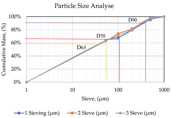The particle size fractions were determined with three repetitions of wet sieving using sieves of 1000, 500, 200, 100, and 53 μm and masses of 50 g, 100 g, and 100 g, using distilled water (Table 1). The average results in Table 1 show that about 71.1% of the particles were under 100 μm and 28.9% were bigger than 100 μm. In addition, the graph (Figure 1) reveals that the three repetitions of the method used to determine the particle size distribution had approximately the same results.