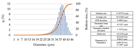 For samples under 53 μm, the laser scattering analyzer was used to determine the size ranges of the fine particles (Figure 2). The results show that 90% were under 27.16 μm and 10% were under 6.84 μm. Normally, the optimum particle size range for froth flotation is under 100 μm [36], but some pretreatment steps, such as agglomeration processes, will probably be needed for samples under 27.16 μm. However, depending on the material being separated, the particle size range will change. For example, graphite beneficiation can follow the particle size range of coal. The optimum size for the maximum flotation recovery of coal is 100–200 microns [37].