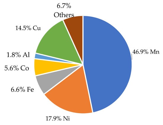 According to the ICP-OES results, the wt.% values of the major elements and Li that existed in the black mass were 23.01% Mn, 20.24% Cu, 7.3% Ni, 5.4% Al, and 3.2% Li (Figure 3).