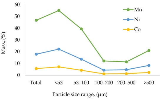 Since the particle size distribution has a direct effect on the selection of separation techniques, key elements such as Mn, Ni, and Co were considered in different particle size fractions. Figure 5 represents the distribution of the Mn, Ni, and Co based on particle size, and it is obvious that more than 50% of Mn, 20% of Ni, and 7% of the Co were on particles smaller than 53 μm, approximately.