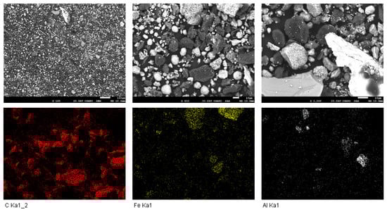 Studying the morphological structure of the black mass using SEM-EDS revealed that there were two types of particles: black particles and white particles [14]. Black particles refer to graphite, and white particles refer to the metals present in the black mass. It should be mentioned that, based on the results, most of the graphite particles were liberated from the metal particles. However, there were some metal particles on the surface of the graphite particles (Figure 7), which were found to be Co, Ni, and Mn, according to the SEM-EDS results, or Li, according to the laser-induced breakdown spectroscopy results. These results will be further explained.