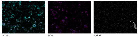 Secondly, the metal analysis was probably focused on other metal particles, such as Ni and Co, rather than the Mn particles. Therefore, less Mn was determined in the metal particles, with 16%. Another possibility is that the Mn concentration was close to the limit of detection, so it could sometimes be seen and sometimes not (Table 4). The elements Na, K, C, and H were detected in the blank; therefore, they were not considered elemental components of the sample. It should be mentioned that Ni and Co are less sensitive and cannot be seen. Therefore, they are not reported in the results (Figure 10).