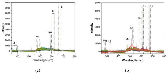 The purpose of performing laser-induced breakdown spectroscopy was to prepare a map of all the particles, especially Li. Since the distribution of the Li particles was not detectable using SEM-EDS, we decided to combine these two methods to determine the distribution of all elements. To determine the distribution of the Li particles, laser-induced breakdown spectroscopy was used to analyze 100 different particles—50 black particles and 50 metallic particles (Figure 9). For laser-induced breakdown spectroscopy analysis, it is necessary to use a laser spot of at least 25 µm to obtain sufficient sensitivity.