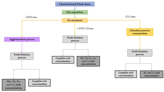 Based on the results of this characterization, the flowsheet for the beneficiation of this black mass is proposed (Figure 12). According to the normalized XRF analysis of different particle size distributions of the black mass, Mn, Ni, Fe, and Co are mostly on the particles smaller than 200 μm. However, Al and Cu are mostly on particles coarser than 200 μm. So, it is suggested that black mass with coarser particle size (0.2–1 mm) go to the liberation process to reduce sizes for beneficiation of the Al and Cu. In addition, black mass with a size range of 0.053–0.2 mm will go to the froth flotation processes for beneficiation of the Mn, Ni, Fe, and Co, as they are major elements in this size range. Finally, a black mass with a size range of <0.053 mm will go through the froth flotation process after the agglomeration process, froth flotation is a widely used process for extracting minerals from ore resources, such as graphite from gangue minerals like quartz or carbonate [10].