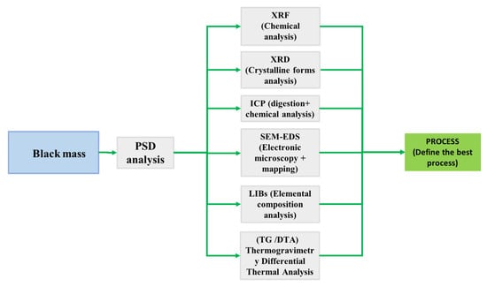 The process of recycling lithium-ion batteries is drawing global attention due to a shortage of critical raw materials (CRMs), a sustainable and environmentally friendly approach that meets the needs of many industries. Characterization is an important step in the recycling of black mass resulting from the processing of a lithium-ion battery at the beginning and the end of the processes because of the complexity of the feed material and to evaluate the process. This research proposes a beneficiation flowchart for the further separation of graphite particles from metal oxides based on the characterization results by combining scanning electron microscopy with energy dispersive spectroscopy (SEM-EDS), laser-induced breakdown spectroscopy, laser scattering particle size distribution analysis, X-ray fluorescence (XRF), X-ray diffraction analysis (XRD), inductively coupled plasma–optical emission spectroscopy (ICP-OES), and thermogravimetry–differential thermal analysis (TG/DTA). Based on these characterization results, it is suggested that black mass with coarser particle size (0.2–1 mm) goes to the liberation process for beneficiation of the Al and Cu and black mass with a size range of 0.053–0.2 mm goes to the froth flotation for beneficiation of the Mn, Ni, Fe, and Co. Finally, a black mass with a size range of <0.053 mm goes through the froth flotation after the agglomeration process.