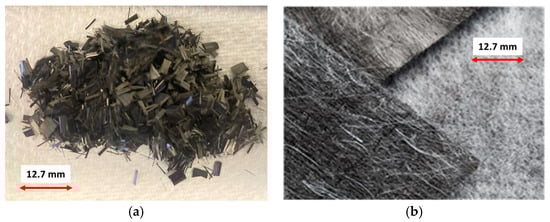 All these competing technologies produce recycled carbon fiber (rCF) in discontinuous chopped or short fiber random and semi-aligned forms, as shown in Figure 1, which leads to reduced mechanical properties in composite parts. The utilization of randomly oriented fibers significantly lower production costs; however, this resulting microstructure adversely affects the desired fiber volume fraction (FVF) and mechanical properties of the composite material. For instance, the tensile strength of MIT’s DEP recycled preforms (156 MPa with a fiber length distribution between 6 and 25 mm) molded with polyester is approximately 20% of that of an equivalent continuous CF quasi-isotropic prepreg composite at 50% FVF, while the resultant tensile modulus translation is 50% (22 GPa). This is primarily due to the random fiber orientation and low fiber loading of the recycled preform [,,,].