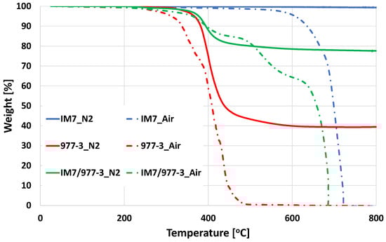 The onset temperature of material degradation was evaluated, as shown in Figure 2. Under N2, the CF exhibited no degradation across the temperature range, while the resin material experienced approximately 70% weight loss at 450 °C, with no further weight loss observed at higher temperatures. The resin formed a char, with the residue amounts unchanged in the absence of an oxidizing environment. However, in an oxygen-rich environment, such as air, both materials experienced significantly higher weight loss. IM7 degradation remained below 5% until 600 °C, with the peak loss rate occurring around 700 °C. The degradation of the neat resin began at 300 °C, with full weight loss occurring at 500 °C in air.
