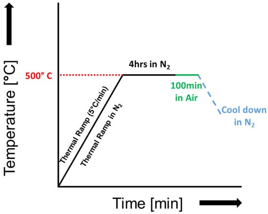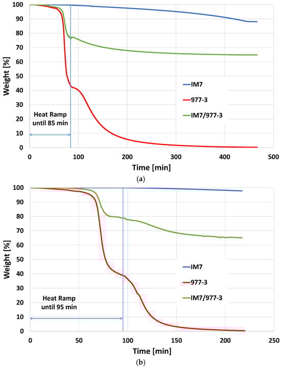 An optimal dwell temperature range must effectively degrade the resin content while minimizing the impact on fiber properties. Based on the behavior of both materials from the non-isothermal runs, an oxidation step is necessary for complete resin removal with a temperature range of 450 °C to 550 °C as the starting point for isothermal experiments. The process begins with initial heating under N2 to degrade a substantial portion of the polymer, followed by switching to an air environment to reduce the required exposure time during the oxidation step [,].