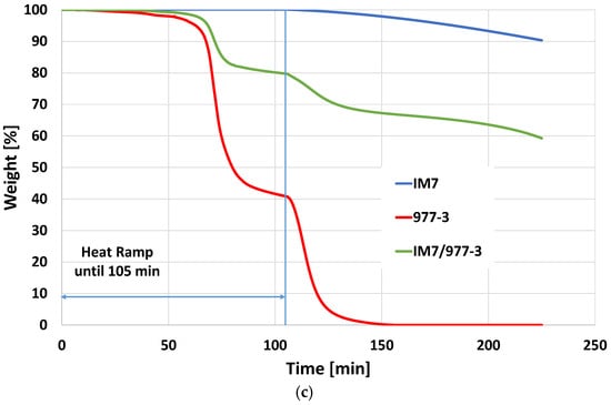 Figure 3a presents the TGA data of a thermal cycle with a dwell temperature of 450 °C, showing the weight loss of IM7 fiber, neat resin, and prepreg material. The heat ramp takes 85 min, degrading ~20% of the prepreg, equivalent to ~60% of the resin content (given the weight ratio of roughly 2:1 fiber to resin in the prepreg). A 33.5% prepreg weight loss is achieved 81 min into the dwell cycle. However, to fully remove the resin residues, an oxidation step is required. Due to the lower temperature needed for residue removal, a longer dwell time in the air was necessary. This prolonged exposure to oxygen led to fiber degradation, with a weight loss rate of approximately −0.018% per minute.