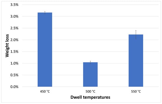 However, to achieve 33% prepreg (including residues) loss under air during the dwell phase, dwell time decreases as temperature increases due to faster degradation rates at higher temperatures. Table 1 presents the loss and loss rate as well as the required dwell time for three levels of resin residue, and Figure 4 compares the weight loss of IM7 fiber at those dwell temperatures and time combinations. The fiber loss is minimal at 500 °C (~1.04%), compared to higher losses at 450 °C (~3.16%) and 550 °C (~2.23%) after the oxidation step. The results are confirmed with a second test with the same parameters, and the values provided are the average values of the two runs. At the lower dwell temperature of 450 °C, the exposure time (257 min) is significantly longer, allowing for prolonged fiber degradation. At 550 °C, the degradation rate accelerates, resulting in greater fiber weight loss than at 500 °C even at a lower dwell time of 35 min. Therefore, the thermal cycle is scaled at 500 °C, as this temperature provides an optimal balance between efficient resin removal and maximizing the potential for fiber strength retention in the recovered fibers.