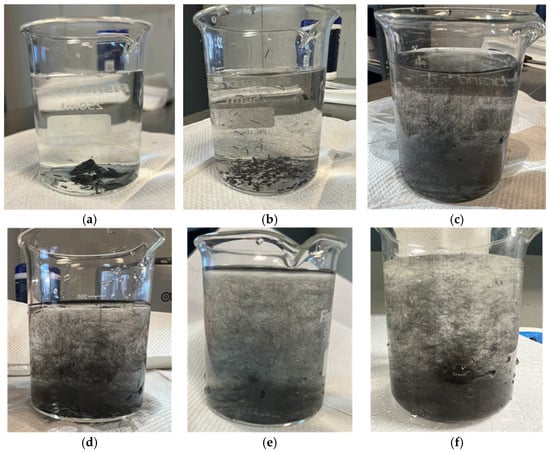 The dispersion assessment involves transferring the short fibers recovered in the GLO furnace into a small jar (150 mm tall) containing water. Upon adding the fibers to the solution, agitation is applied to separate the fibers. The water-to-fiber ratio is scaled as per the dilution ratio of the TuFF process, resulting in water level variation for each picture. However, it is critical to consider that, in all cases, the concentration of fiber is consistent. This is a qualitative assessment of the dispersion at a lab scale to provide a visual confirmation to proceed. In cases where the thermal cycle was ineffective, and residue remains, the fibers do not separate, and agglomerates settle rapidly, as seen in Figure 5a, where there is no oxidation step at all and Figure 5b, where the oxidation is only for 60 min. Conversely, the successful oxidation step removes residues, resulting in mostly dispersed fibers at the filament level, which float along with the solution that can be seen in Figure 5c–f for an oxidation time of 70 min and longer.