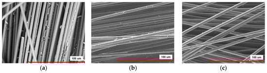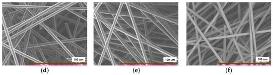 SEM images of recovered fibers for (a) ISO–1, (b) ISO–3, (c) ISO–5, (d) ISO–7, (e) ISO–9, (f) ISO–11.