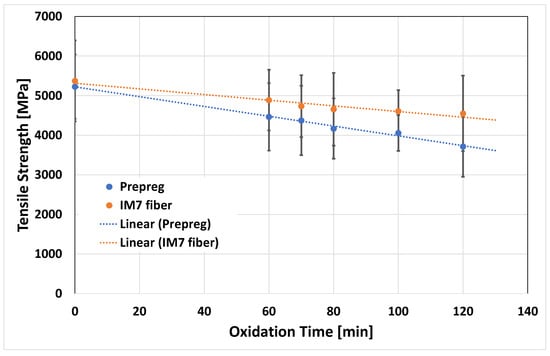 Samples of ~76 mm long prepreg and virgin fiber were also subjected to the optimized thermal cycle, as mentioned earlier. The long fibers recovered from the prepreg and the virgin fiber material after recycling underwent testing to assess fiber strength, which was then compared to the strength properties of virgin fiber. The results are summarized in Table 3, and the degradation trend is depicted in Figure 7. The strength of the virgin fiber (5400 MPa ± 1000 MPa) fell within one standard deviation of the Hexcel datasheet values for IM7 fiber at 5516 MPa. While the fibers did not degrade after the pyrolysis step, exposure to air during the oxidation step significantly reduced their strength. At an oxidation time of 120 min, the fiber strength of the recovered virgin and prepreg fiber material decreased to 4550 MPa ± 954 MPa and 3715 MPa ± 762 MPa, respectively. This represents an 18% and 33% reduction in fiber strength compared to the virgin material. Both materials exhibit a decreasing trend in tensile strength with increasing oxidation time. However, the slope of the degradation trend suggests that fibers in prepreg degrade at a faster rate compared to virgin IM7 fibers. This is evident from the steeper downward slope of the linear trend line for prepreg fibers. Notably, the virgin material exhibited higher strength numbers compared to the fiber material recovered from the prepreg. This discrepancy can be understood by considering carbon fibers as chains, where high temperatures induce chain breakage, resulting in a drastic reduction in strength. In virgin fibers, these are clean chains unaffected by external sources such as surface effects or resin residues. Conversely, in recycled fibers, the resin residue on the fiber surface may act as a weak link in the chain, inducing stresses at specific locations on the fiber surface. At increasing loads, this weak link breaks first, facilitating the propagation of breaks throughout the chain more easily compared to virgin fiber due to localized stress concentrations. Essentially, the resin residue accelerates chain breakage. Similar studies on the impact of surface defects on fiber degradation have been explored [,,,]. Additional studies are needed to explain the mechanisms in detail and will be the focus of additional studies.