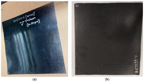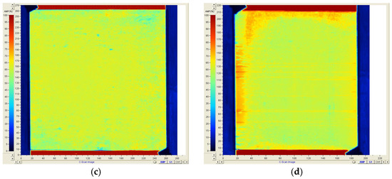 An ultrasonic C-scan evaluates panel consistency and quality. The processed virgin and recycled panels after prepregging and autoclave curing are shown in Figure 10a,b, with corresponding C-scans in Figure 10c,d. Panel edges were slightly dry due to resin loss at the panel edges, which is also indicative of the higher attenuation observed in the C-scan picture for recycled panels. No signs of internal voids or porosity were detected, which can be the result of higher autoclave pressures. Test samples were extracted from the interior, showing consistent quality.