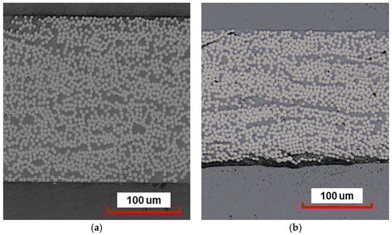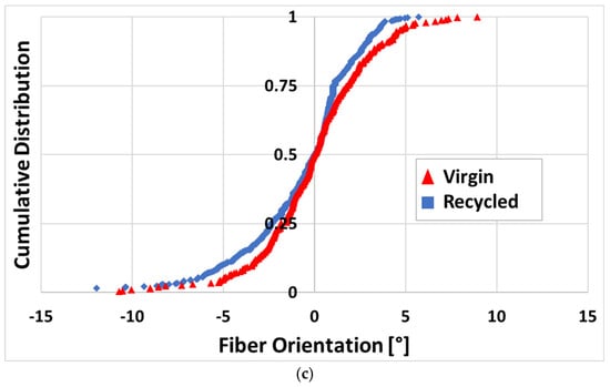 Cross-sectional microscopy further examined the panel quality and consistency, revealing high packing efficiency with no significant internal voids or resin-rich areas, validating the C-Scan analysis. The images can be seen in Figure 11a,b. Fiber orientation was evaluated with cross-sections cut at 75 degrees, major and minor axes of more than 200 fibers were measured, and the data was used to calculate and plot the fiber orientation distribution. The virgin fiber coupon exhibited good alignment quality, with 96% of all fibers within 5 degrees centered around the alignment direction. The fiber orientation of the recycled coupon showed a total of 93% of all fibers within 5 degrees, with most of the misaligned fibers located in one direction, as shown in Figure 11c.