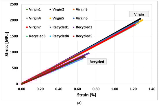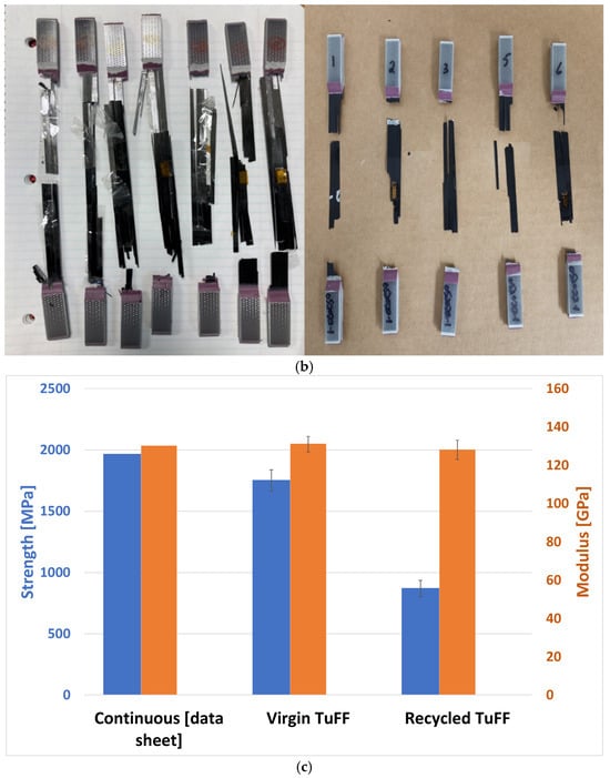 Test coupons were extracted from the processed panels and evaluated for their strengths and modulus translation. The stress-strain behavior is shown in Figure 12a. The measured tensile strength of 870 MPa ± 66 MPa and tensile modulus of 128 GPa ± 4.84 GPa indicate complete modulus translation compared to both the virgin continuous fiber prepreg material from the Hexel datasheet, normalized to 50% FVF and virgin TuFF composite as shown in Figure 12c. However, the strength translation showed a reduction of ~50% compared to virgin TuFF and ~55% compared to virgin continuous, which can be attributed to factors such as fiber degradation, loss of fiber/resin adhesion [] and potential for some remaining agglomeration in the recycled TuFF preform. The virgin TuFF composite showed a small reduction in strength (7%) compared to the datasheet and might require longer fibers to improve stress translation between the discontinuous fiber material for this particular epoxy resin and sizing combination. This is also indicative of the complete non-explosive failure mode of the specimens, as seen in Figure 12b.