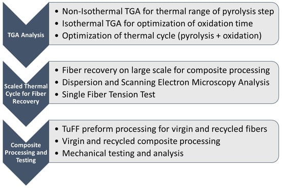 The flowchart shown in Figure 14 outlines a systematic approach to optimize our composite recycling and processing. It begins with a Thermo-Gravimetric Analysis (TGA), optimizing thermal degradation and oxidation conditions to refine the recovery process. The methodology then advances to the scaling of the thermal cycle for fiber recovery, facilitating large-scale fiber reclamation, microstructural characterization via scanning electron microscopy (SEM), and mechanical assessment at the filament level. The final stage integrates recovered fibers into TuFF preform architectures for composite processing, testing and mechanical evaluation of both virgin and recycled composite systems.