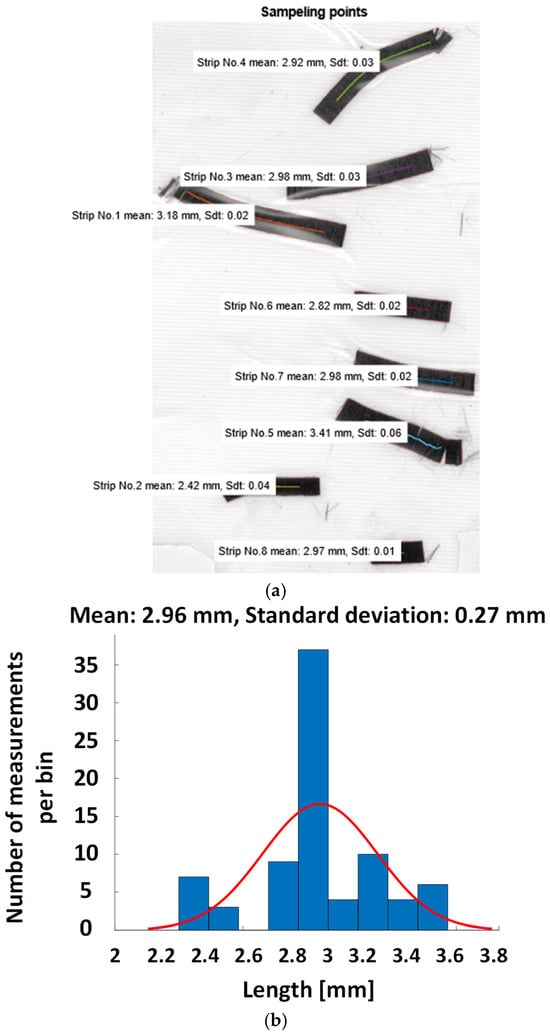 Chopped prepreg material length analysis. (a) Example of cut prepreg pieces, software detecting the samples representation and (b) Length distribution of ~80 samples.