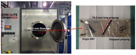 For large-scale recycling, a GLO 40/11-2G semi-automatic furnace from Carbolite Gero/Verder Scientific (Stuttgart/Germany) was employed, utilizing optimized thermal conditions obtained from TGA analysis. This furnace allows for precise control of the gas environment and heating cycle during the recycling process. Gas switching is automated, facilitating PID-controlled heating to the dwell temperature under N2, followed by exposure to air. Figure 16 illustrates the equipment and chamber, featuring a sample holder crafted from stainless steel mesh. The mesh, secured horizontally by four posts, possesses an opening of 10 × 10 per inch with a 0.635 mm wire diameter, resulting in an opened area of 56%, ensuring adequate gas exposure on both sides. Three input material formats are consistently maintained: chopped prepreg for investigations into recycling quality and surface characteristics and long fiber tows in both prepreg (~76 mm long) and unsized fiber (~62 mm long) form for studies on strength degradation.