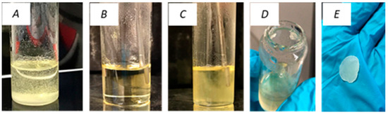 PVDF dissolution with Cyrene: Cyrene-PVDF mixture at room temperature, (A) heated solution at 100 °C (B), mixture cooled at 53 °C (C), mixture at room temperature (D), and recovered PVDF after centrifugation of mixture at room temperature (E).