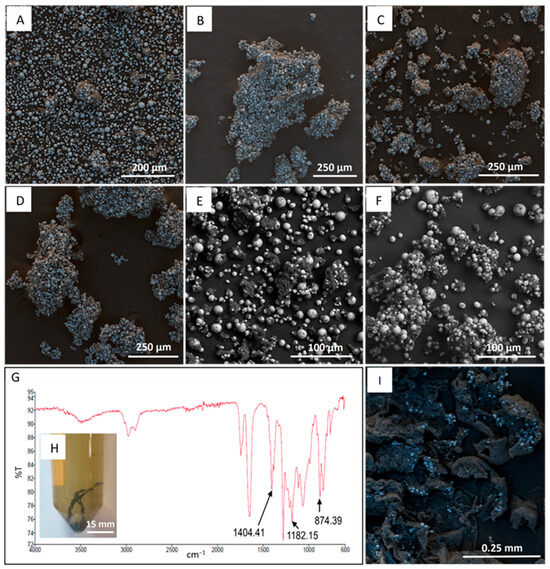 SEM images of NMC and PVDF material. NMC 811 coated with PVDF (A), NMC 811 post Cyrene pretreatment (only washing with 100 °C water) (B–D), SEM-BSE of NMC 811 post Cyrene pretreatment (E,F), FTIR spectra of PVDF recovered from Cyrene solution (G). Cyrene-water solution and recovered PVDF (H). SEM image of recovered PVDF (I).