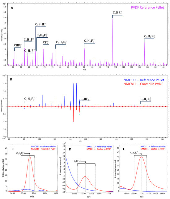 Positive ToF-SIMS spectra of PVDF (A), comparison of the spectra for NMC 111 and NMC 811 coated in PVDF (B), and characteristic PVDF peaks from Figure 4B (C–E).