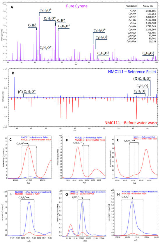 Positive ToF-SIMS spectra of Cyrene (A), comparison of the spectra for NMC 111 and Cyrene washed NMC 111 (B), characteristic Cyrene peaks from Figure 5B (C–E), and characteristic PVDF peaks after Cyrene pretreatment of NMC811 (F–H).