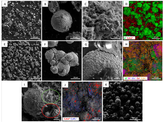 SEM and ToF-SIMS chemical mapping of the treated battery materials. Cyrene pretreated NMC 811 (A–C), ToF-SIMS chemical mapping of Cyrene pretreated NMC 811 (D), pyrolyzed NMC 811 samples (E–G), ToF-SIMS chemical mapping of pyrolyzed NMC 811 (H), NMC 811 particle after pyrolysis (I), chemical mapping of the characteristic PVDF peaks after pyrolysis (J) and residue from PVDF pyrolysis at 800 °C (K).