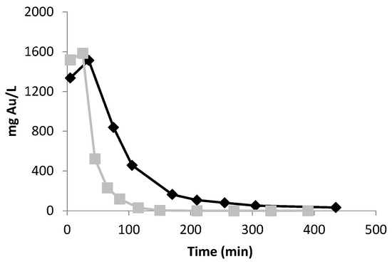 - Dicinoski, G.W.; Gahan, L.R.; Lawson, P.J.; Rideout, J.A. Application of the shrinking core model to the kinetics of extraction of gold(I), silver(I) and nickel(II) cyanide complexes by novel anion exchange resins. Hydrometallurgy 2000, 56, 323–336. [Google Scholar] [CrossRef]