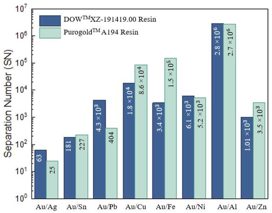 2.2.2. Concentration and Selectivity Ability of Resins for Gold