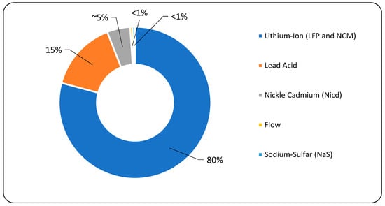 According to Figure 2 [2], Lithium-ion (Li-ion) batteries dominate the market, accounting for approximately 75 to 80 percent of usage in various applications. Their high energy density, long life cycle, and efficiency account for this widespread use. The characteristics of (Li-ion) batteries make them ideal for (EVs), and a wide range of other applications.