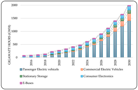 In the transportation sector, batteries are revolutionizing the use of (EVs) in various forms. (Li-ion) batteries are critical in replacing traditional gasoline-powered vehicles with electric models. Figure 3 [3] shows that (Li-ion) batteries are primarily used in five crucial applications, with the largest share going to passenger electric vehicles. The demand for these batteries used in (EVs) has increased dramatically, from nearly 12 GWh in 2015 to an anticipated 1400 GWh by 2030. Overall, the need for (Li-ion) batteries has surged from 20 GWh in 2010 to 290 GWh in 2019, with forecasts suggesting it will reach 2000 GWh by 2030, accounting for roughly 10% of the global energy supply.