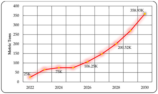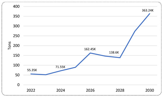 To address this challenge, China has implemented a series of regulatory measures targeting the reuse, recycling, and traceability of EV batteries. According to projections, battery waste is expected to reach nearly 360,000 metric tons by 2030, over three times the estimated level in 2025 Figure 10. This alarming trend has prompted the government to enforce new national standards effective from December 2023, requiring EV manufacturers and battery suppliers to adopt robust recycling and traceability mechanisms [19,20].