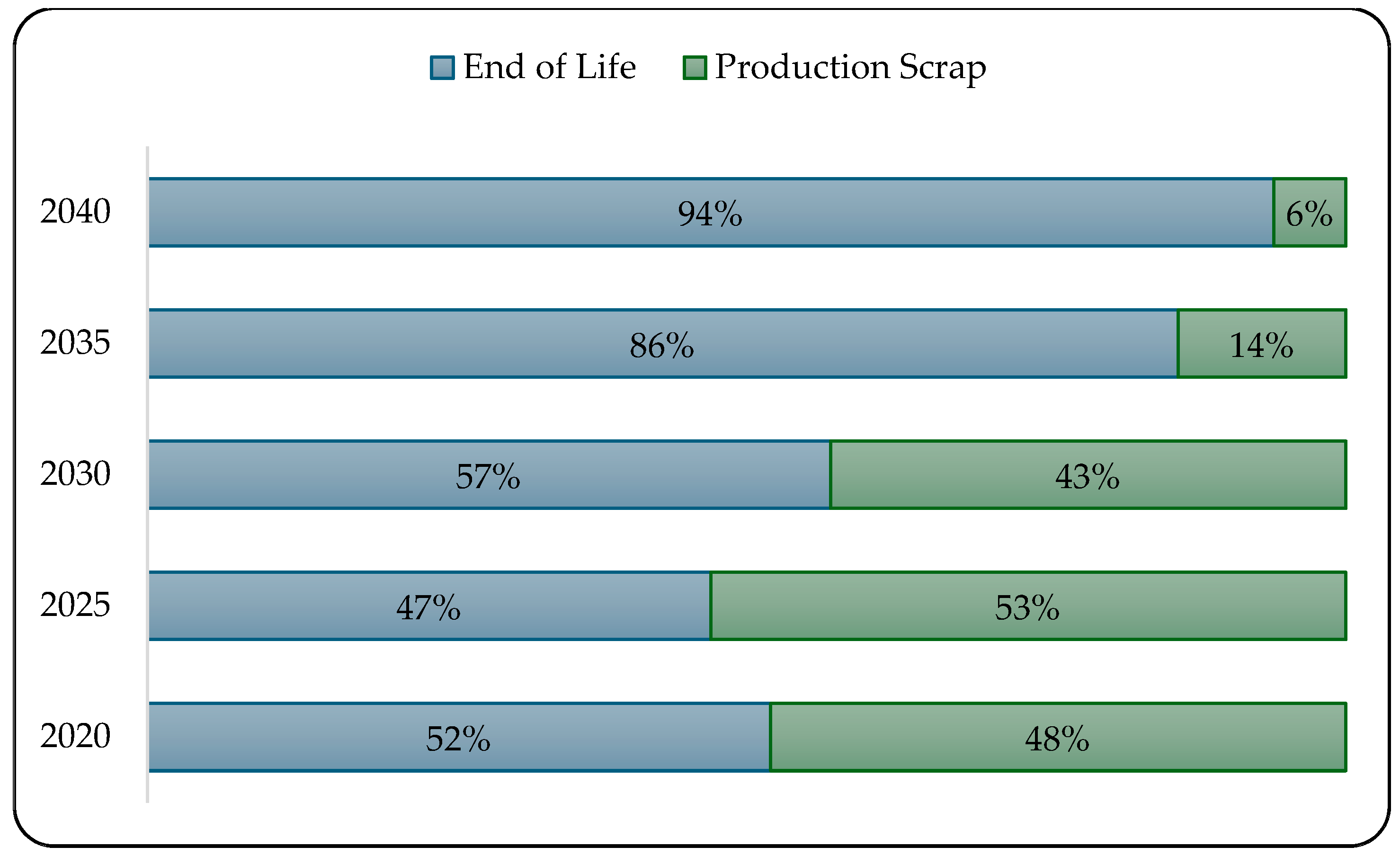 Governments and regulatory organizations are implementing policies to control battery lifecycles more frequently, such as mandated recycling, financial incentives for recycling infrastructure, and safe disposal guidelines. As illustrated in Figure 4 [6], the percentage of EOL batteries, particularly from EVs, is projected to grow from 52% in 2020 to 94% by 2040, addressing environmental pollution concerns due to the rise in EOL batteries—technological advancements in recycling aim to improve efficiency and cost-effectiveness while fostering sustainable growth. Global efforts are essential to maximizing the benefits of Li-ion batteries while minimizing their environmental and economic impacts.