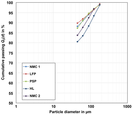 Figure 1 shows the particle size distributions of the five black mass samples. The particle size distribution shows that approx. 90% of the NMC 1, LFP, and PSP samples are <45 µm. The HL and NMC 2 samples are coarser, with 90% < 90 µm.