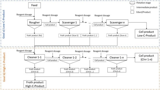 The flotation tests are performed according to the general flotation scheme shown in Figure 3 to achieve a low-carbon product and a high-carbon product. The flotation scheme consists of different flotation stages—the rougher, scavenger, and cleaner stages. The test procedure is defined in a way to reach the desired froth and cell products. The upper part of Figure 3 represents the process steps for the low-carbon (Low-C) product, whereas the lower part depicts the process steps for the carbon-rich (High-C) product.