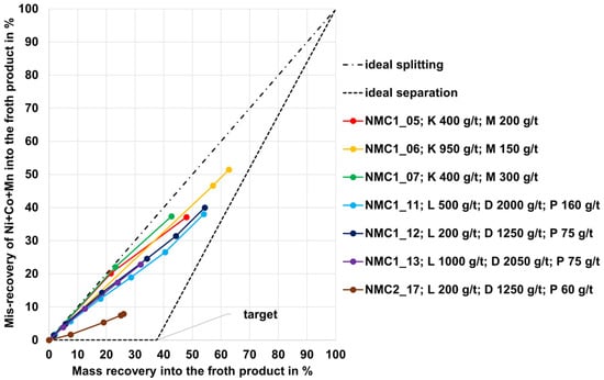 In Figure 4, the mis-recovery of Ni+Co+Mn (which is the undesirable recovery of these elements into the froth product) from the NMC samples is represented on the y-axis, while the mass recovery into the froth product is represented on the x-axis. Two conceptual curves are shown in Figure 4. One of them is the ideal splitting (straight dashed-dotted line) representing a separation process without any enrichment of the carbon in the froth product (worst case). The other curve represents the ideal separation (dashed line) and ranges horizontally in the first part up to the optimum mass recovery at a mis-recovery of 0%. The optimum mass recovery corresponds to the carbon grade in the flotation feed (NMC1 37.6 wt.% carbon, see Table 1). This point (“target”) represents a total recovery of the carbon in the froth product without any impurities of Ni+Co+Mn (best case). In the second part, the curve runs straight to 100% mis-recovery into the froth product and 100% mass recovery into the froth product. This means that any further mass recovery would lead to a mis-recovery of Ni+Co+Mn. The result is a triangular area between the two conceptual curves. Upgrading curves within this area represent sorting results with an enrichment of carbon in the froth product. The closer the upgrading curve is to the ideal separation and the closer it ends to the target point, the better the sorting result. This means that there is less mis-recovery and therefore the graphite is more selectively enriched and recovered into the froth product. Conversely, this means that upgrading curves close to the ideal splitting mean a poor sorting result. In this case, a higher mis-recovery of Ni+Co+Mn takes place. This means a non-selective enrichment of the graphite in the froth product. Upgrading curves to the left of this triangular area would represent a separation result that corresponds to an enrichment of Ni+Co+Mn in the froth product instead of carbon, whereas upgrading curves to the right are not physically possible. Each data point on the upgrading curves shown in Figure 4 represents a rougher and subsequent scavenger stage (further details stages numbers and reagent dosages can be found in Appendix A, Table A1).