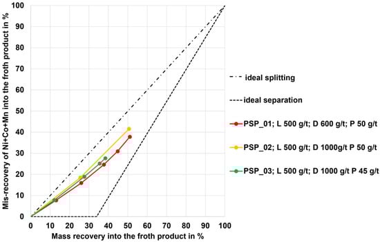 For the PSP black mass sample (mixture of graphite anode material and NMC as well as LCO cathode material), the flotation results are given in Figure 5 as MAYER upgrading curves. For the tests, the reagent regime LDP is applied with different dosages and numbers of flotation stages. The resulting upgrading curves are quite similar to those of sample NMC 1. With a mass recovery between 38 and 51% and a mis-recovery of Ni+Co+Mn between 27 and 41%, all curves exceed the optimum mass recovery of 33.9%. Thus, these sorting results are also inadequate regarding the selective enrichment of carbon in the froth product. The absolute values in the form of the grade of the final froth product are given in Table 2 (last row), which are comparable to those from sample NMC 1.