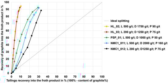 In Figure 9, the recovery of carbon into the froth product is shown on the y-axis, while the recovery of tailings (i.e., every other element except carbon) into the froth product is shown on the x-axis. There are two conceptual curves; the first is a diagonal dashed line depicting ideal splitting with the meaning of no selective carbon enrichment in the froth product (worst case). The other ideal curve is represented by the y-axis, depicting an ideal separation (best case). Upgrading curves inside of the triangular area between those two conceptual curves have a selective enrichment of carbon into the froth product. This is because the recovery of carbon is higher than the recovery of the tailings. For selective carbon separation, the aim is that the end of the upgrading curves is near the left upper corner.