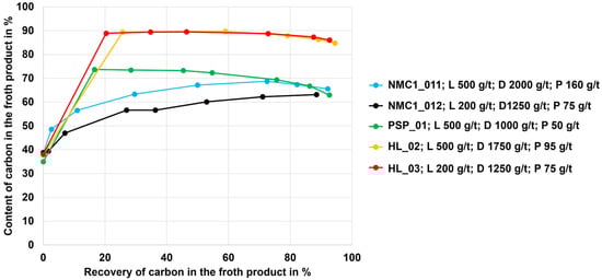 The y-axis shows the carbon content in the froth product, whereas the carbon recovery into the froth product is displayed on the x-axis. The curve begins with a recovery of 0%, representing the feed material (corresponding to an initial carbon content in the black mass samples of ~40 wt.%). The curves must be interpreted from left to right, where each data point on the curve represents an intermediate froth product during the flotation scheme (i.e., after every rougher and scavenger stage). It is evident that the HL black mass sample shows the best separation selectivity for the chosen flotation parameters and reagents. The final carbon contents in the froth product of ~90 wt.% are reached. The PSP black mass shows the second best flotation selectivity, followed by the NMC samples (NMC 1 and NMC 2).