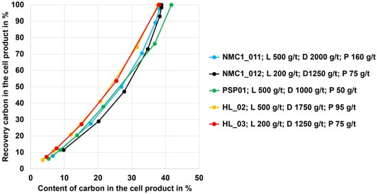 The y-axis displays the recovery of carbon in the cell product, while the carbon content in the cell product is shown on the x-axis. The curve begins with a recovery of 100%, representing the feed material. The curves must be interpreted from right to left, where each data point on the curves represents an intermediate cell product during the flotation scheme (i.e., after every scavenger step). The recovery of carbon was in the range of 5–10% for the different black mass samples with corresponding carbon contents between 4 and 10 wt.%. In case a certain carbon content was valuable, e.g., to reduce the demand of a reducing agent during a subsequent pyrometallurgical black mass treatment (assuming that solid carbon powder is used to pyrometallurgically reduce metals from the black mass), the flotation process can principally be stopped at any position on the curve, i.e., after a certain number of scavenger steps.